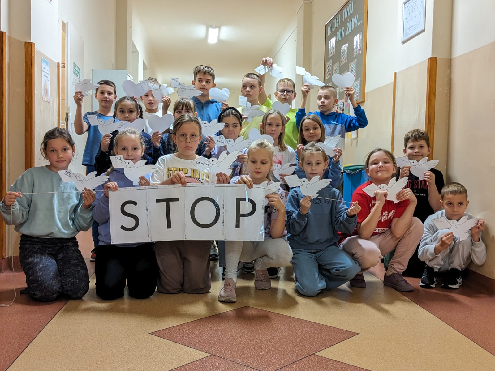 Jedną z wielu akcji w ramach KAMPANII BIAŁYCH SERC jest BIAŁY GOŁĄBEK POKOJU. To właśnie najmłodsi uczniowie z naszej szkoły zachęceni do pokojowego działania wzięli udział w tej akcji mówiąc, STOP WOJNIE! STOP PRZEMOCY! Dzieci wycięły gołąbka z kartki i na kopercie, którą trzyma w dzióbku napisały krótkie, przesłanie antywojenne. Teraz wystarczy zapakować Białe Gołąbie w kopertę i wysłać do GRUPY ZALEWSKI. GRUPA ZALEWSKI, w zależności ile pokojowych gołąbków do niej dotrze, podzieli je i część wyśle, żeby poleciała z przesłaniem pokoju do Ambasady Rosyjskiej, a część do Ambasady Izraela.
