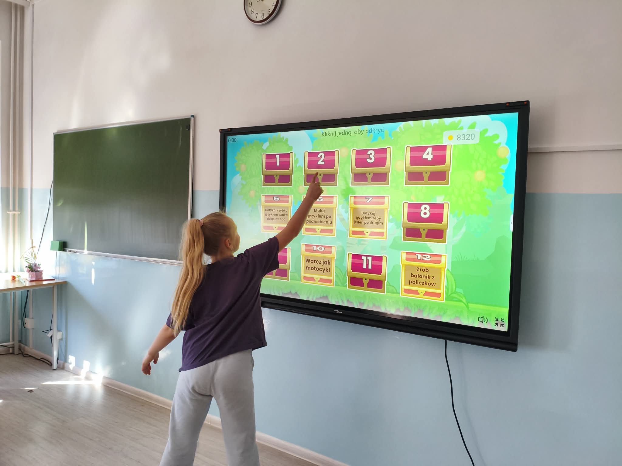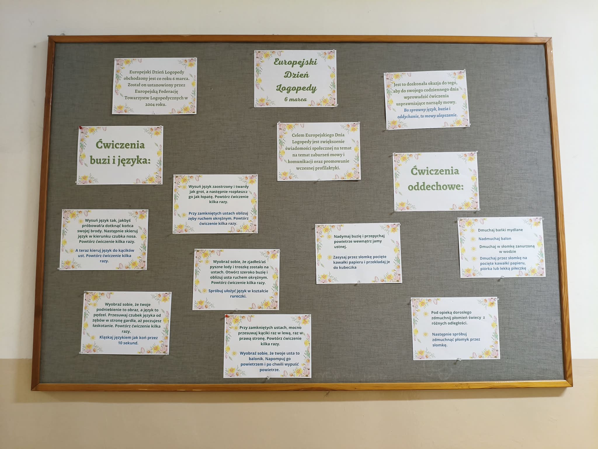 Na szkolnym korytarzu zawisła również opracowana przez Panią Martę Kwilman gazetka, na której dzieci znajdą różne pomysły na usprawnianie narządów mowy.