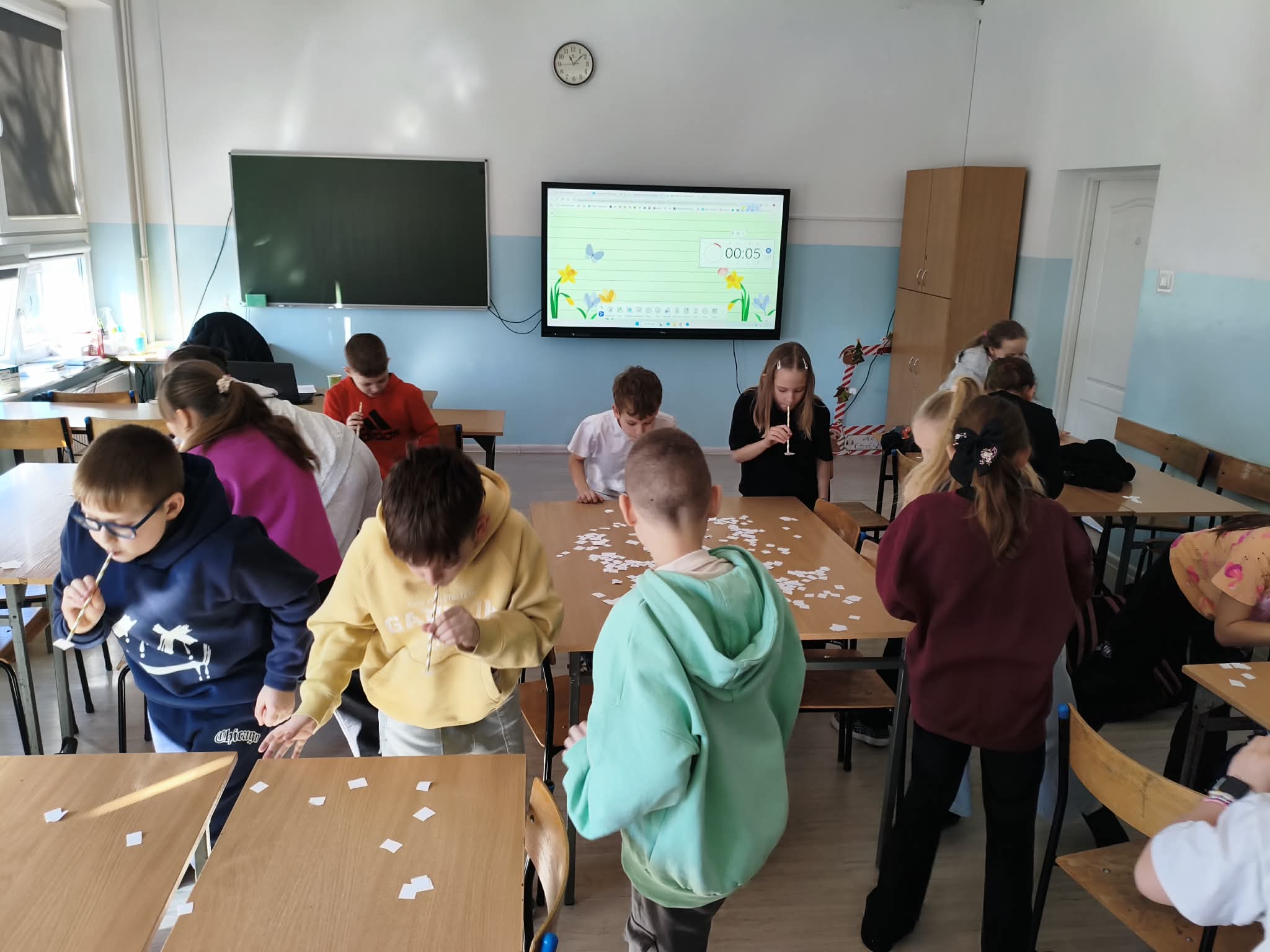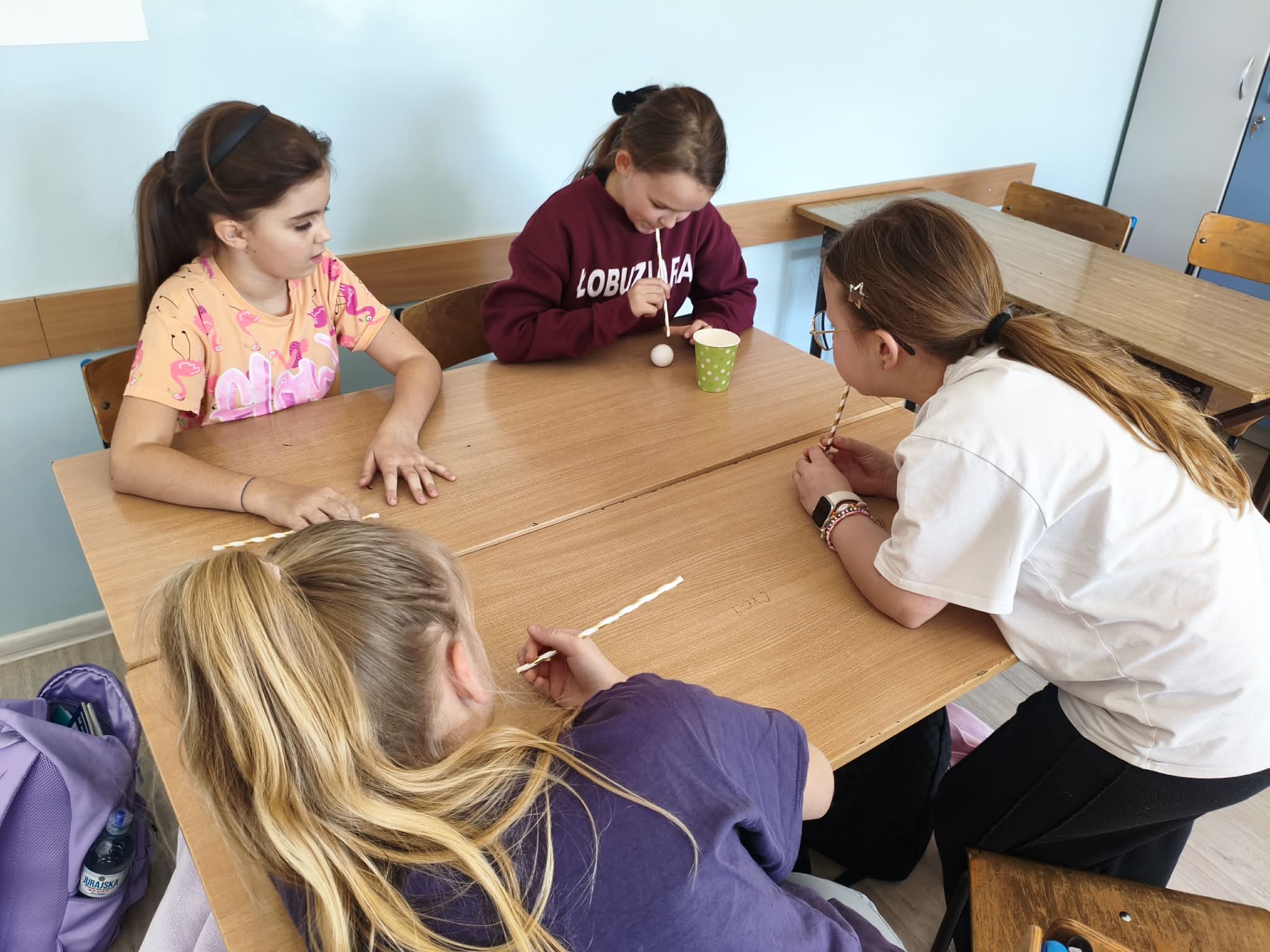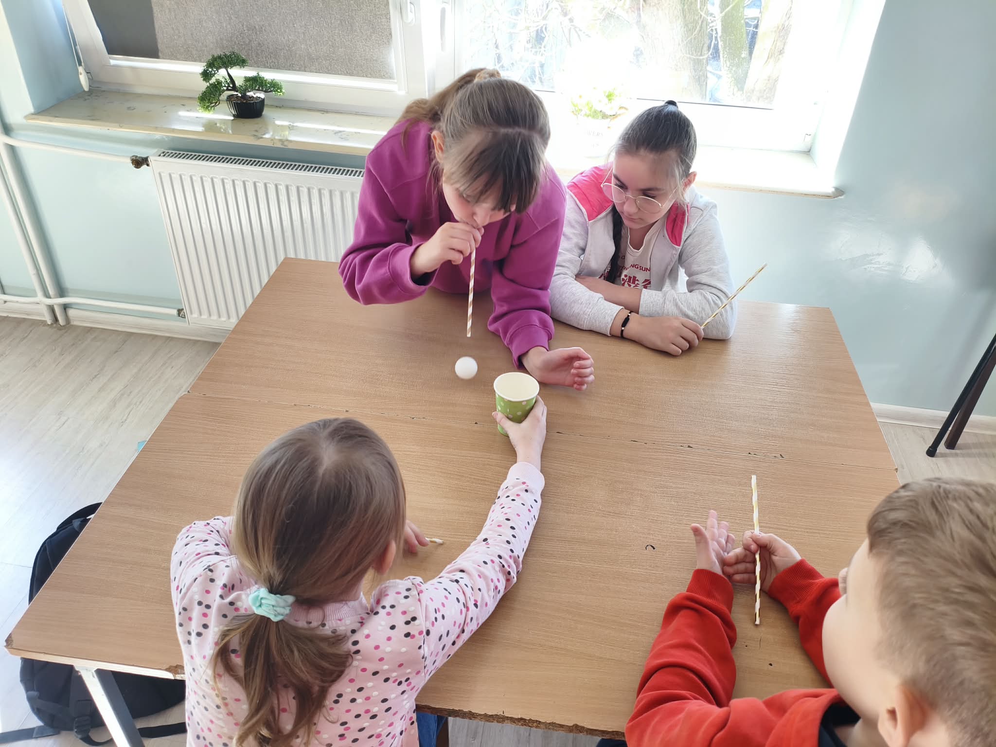 Nie zabrakło również wesołych ćwiczeń buzi i języka – gimnastykowaliśmy nasze aparaty mowy, robiliśmy śmieszne miny, dmuchaliśmy, parskaliśmy i ćwiczyliśmy prawidłowe oddychanie. Było dużo śmiechu i świetnej zabawy, a przy okazji ważnej nauki. Dużym zainteresowaniem wśród dzieci cieszyły się ćwiczenia oddechowe z wykorzystaniem słomek, piórek, karteczek i piłeczek.