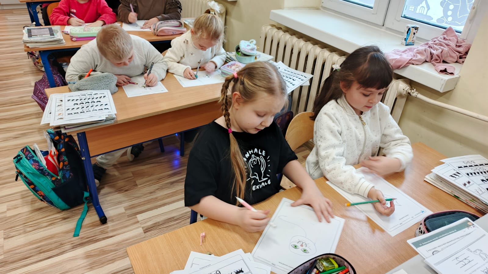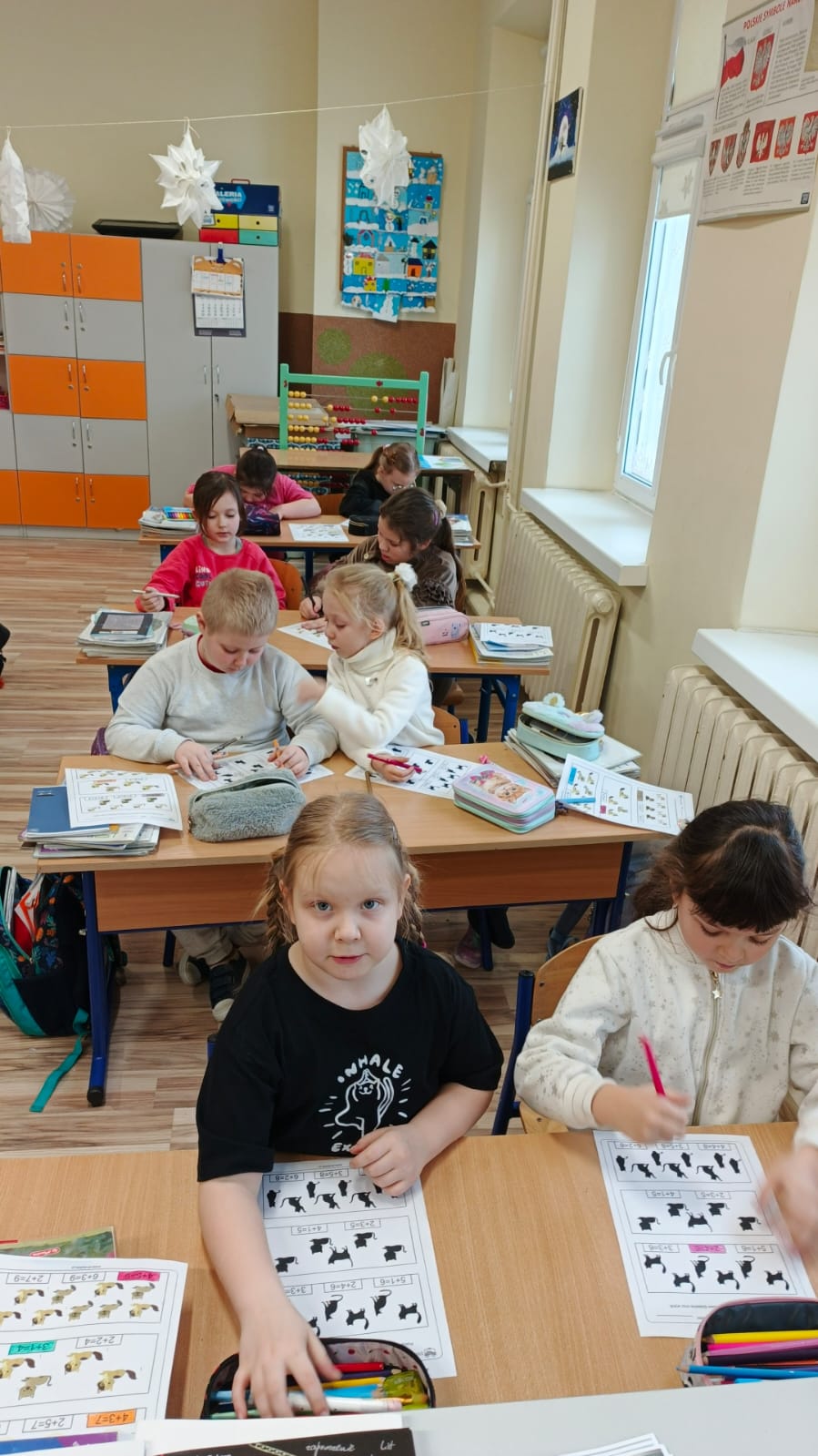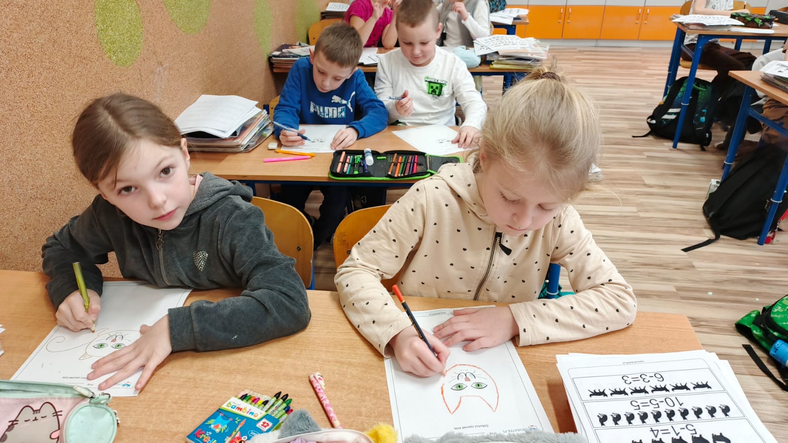 Pierwszoklasiści rozwiązywali zadania matematyczne w których głównymi bohaterami były koty. Liczenie sylwetek kotów, tworzenie samodzielnie działań czy porównywanie gdzie jest więcej sprawiły że matematyka stała się czystą przyjemnością.