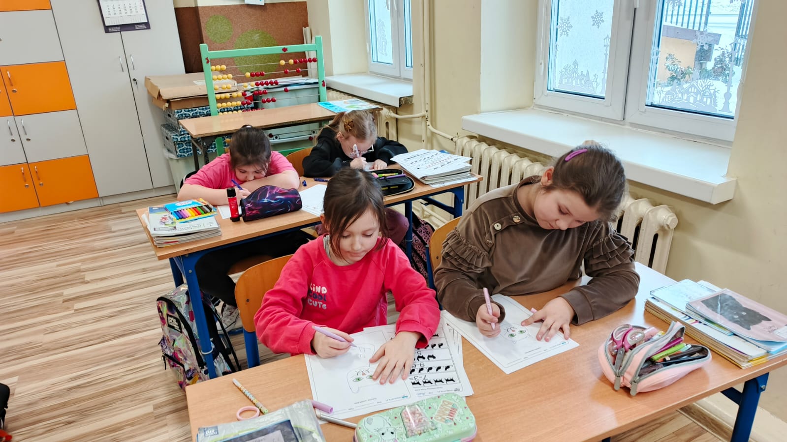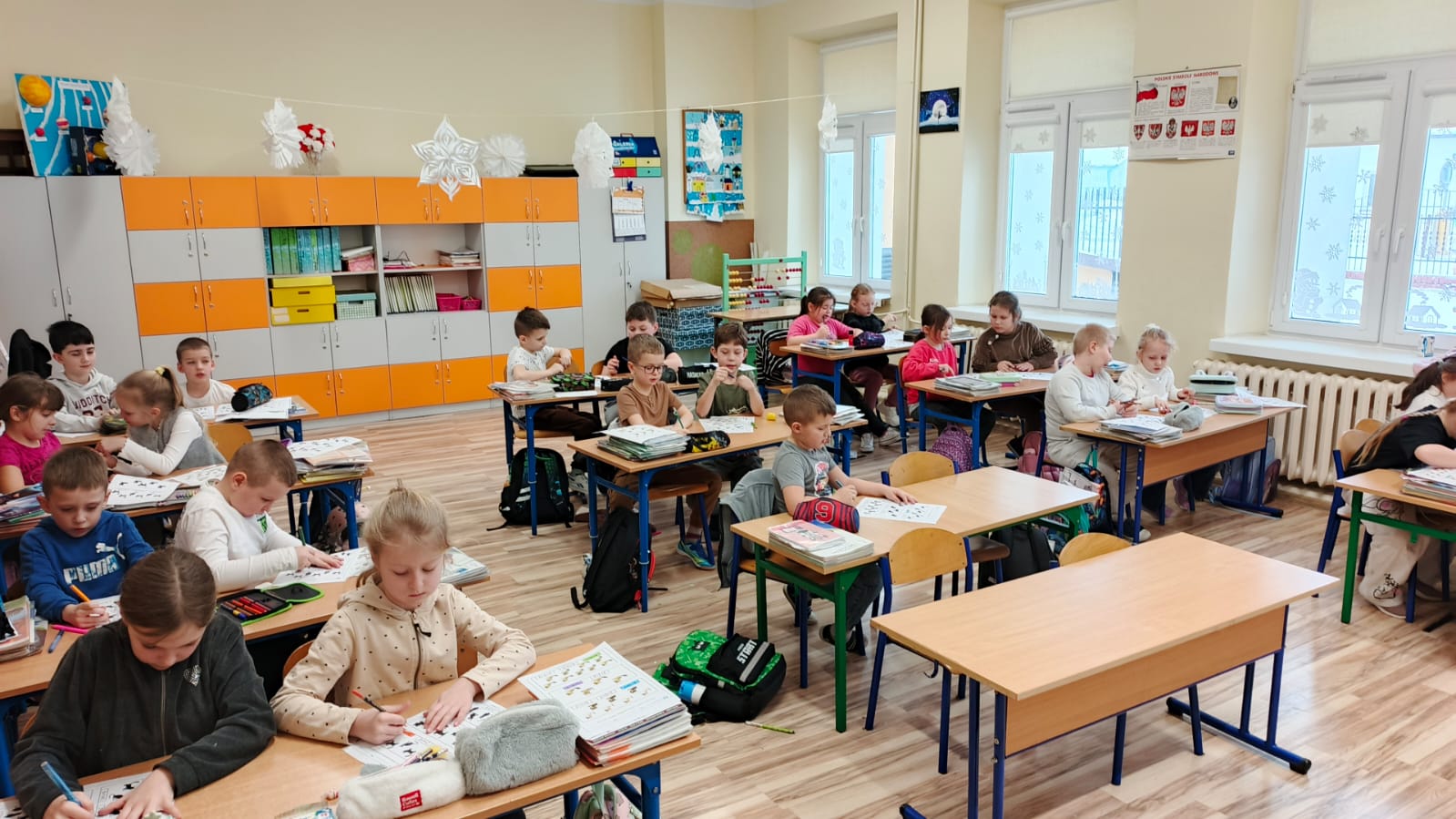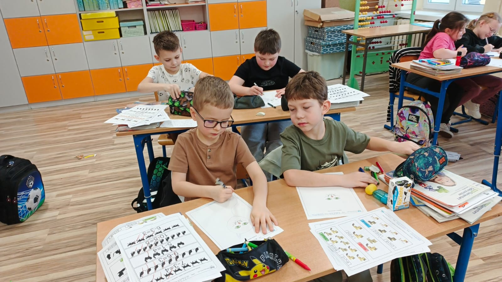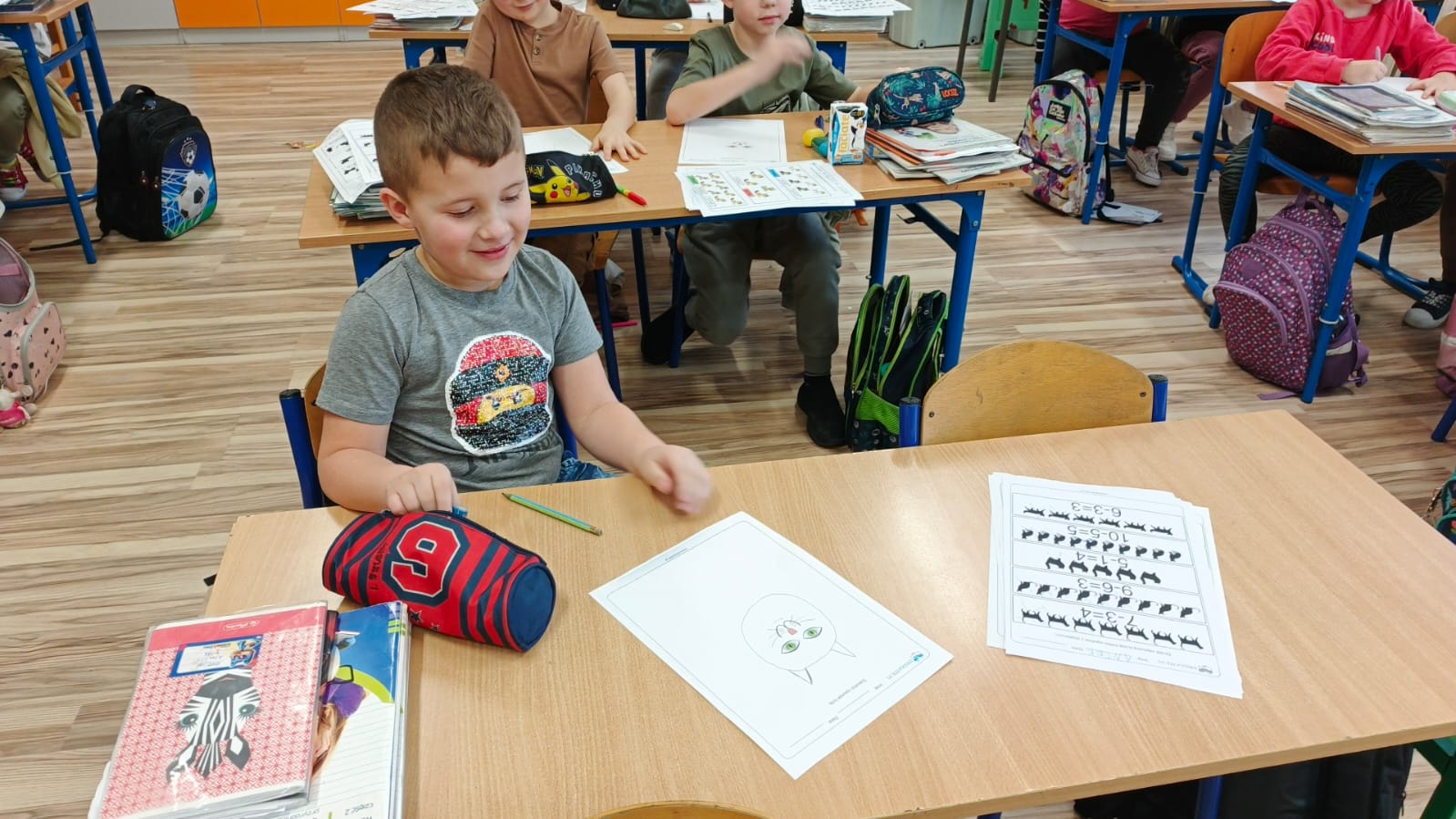 Pierwszoklasiści rozwiązywali zadania matematyczne w których głównymi bohaterami były koty. Liczenie sylwetek kotów, tworzenie samodzielnie działań czy porównywanie gdzie jest więcej sprawiły że matematyka stała się czystą przyjemnością.