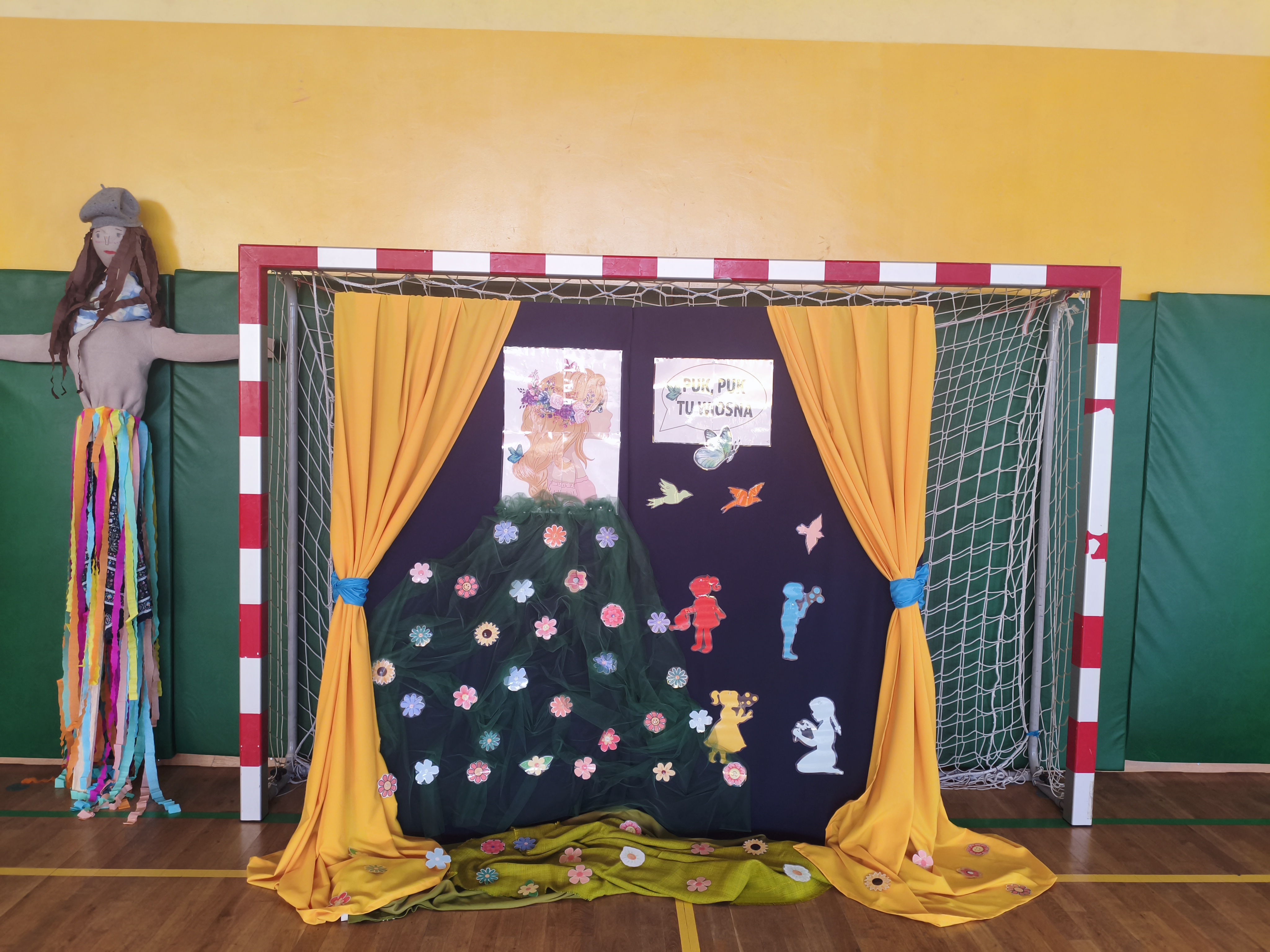 Po powrocie do szkoły uczniowie kontynuowali świętowanie w sali gimnastycznej. Tam czekały na nich kolejne atrakcje – wspólne zabawy ruchowe, tworzenie wyjątkowej sukni dla Pani Wiosny oraz kolorowanie wielkoformatowych, wiosennych ilustracji (tzw. kolorowanki XL), które dostarczyły dzieciom wiele radości i pozwoliły na wspólną pracę w grupach.