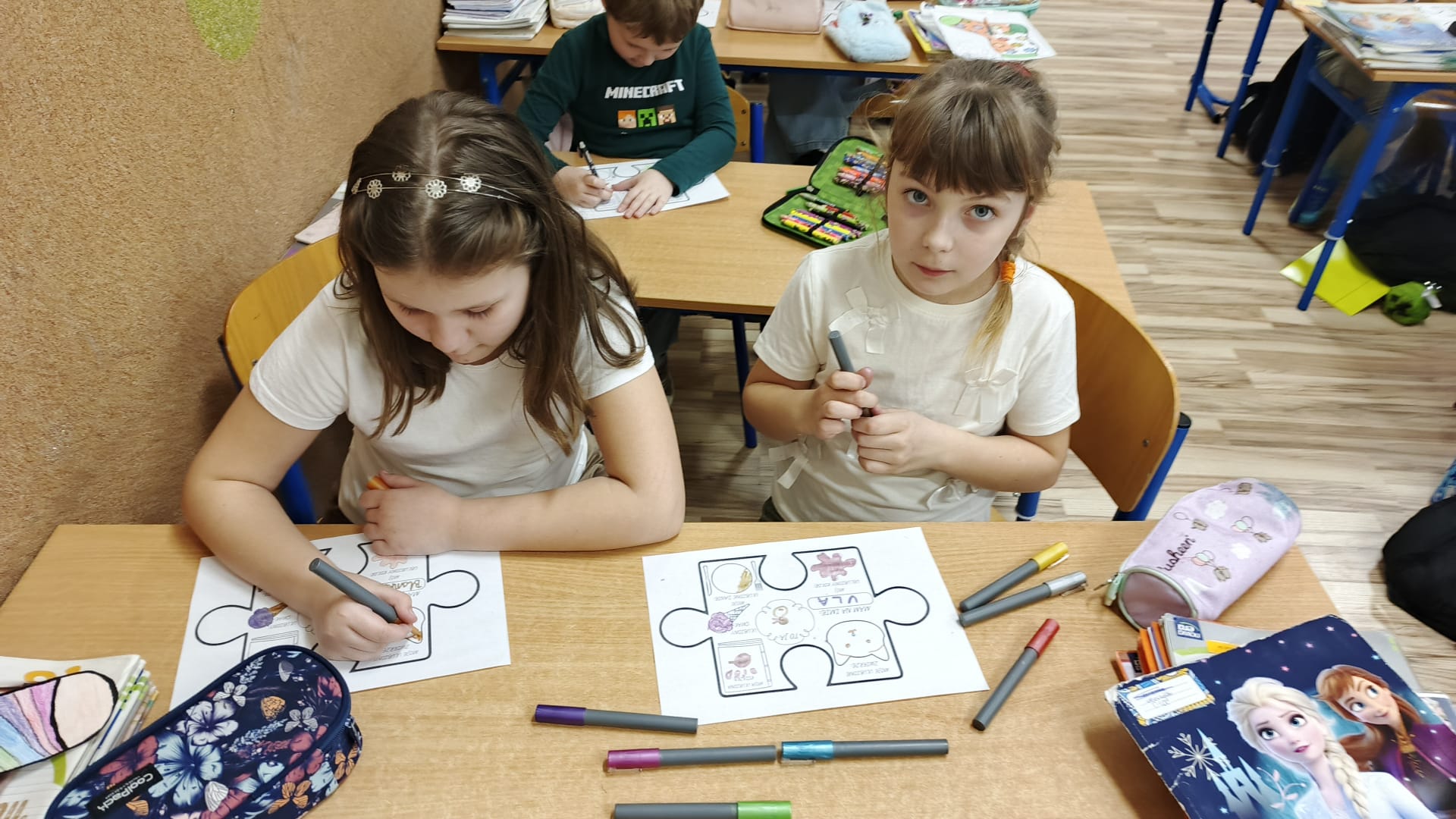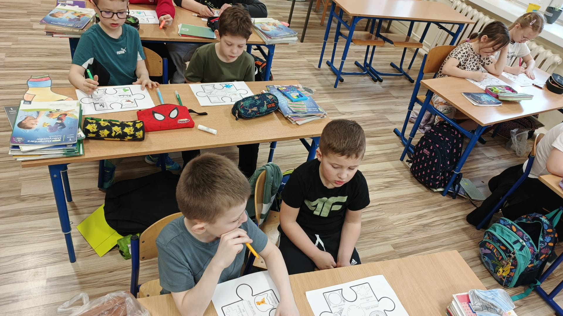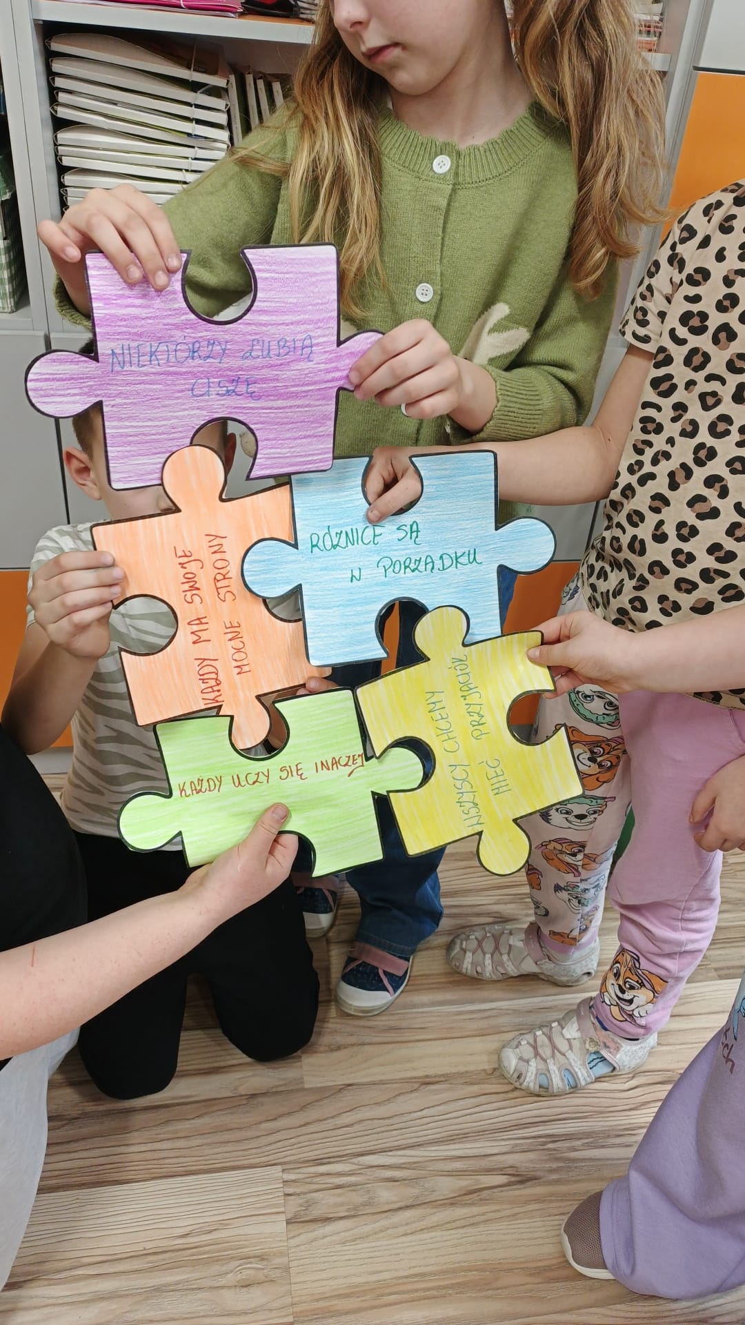 Uczniowie klasy 1a rozpoczęli realizację projektu. Nasi najmłodsi podeszli do tematu z wielkim zaangażowaniem i empatią. Dzieci uczestniczyły w zajęciach mających na celu kształtowanie postaw akceptacji i zrozumienia wobec osób w spektrum autyzmu oraz różnorodności między ludźmi. Podczas rozmowy kierowanej dzieci dowiedziały się, że osoby w spektrum mogą inaczej odbierać świat, np. być wrażliwe na hałas lub potrzebować więcej czasu na odpowiedź. Uczniowie przygotowali autorskie puzzle, na których przedstawili swoje ulubione kolory, ukochane zwierzęta oraz jakie dania najbardziej preferują. Ta część zadania wspaniale pokazała jak każdy z nas jest inny. Dzieci stworzyły także kolorową układankę różnorodności, opatrzoną hasłami takimi jak: Każdy z nas jest inny, Różnice są w porządku itd. Zajęcia pokazały, że dla naszych uczniów bycie dobrym kolegą i wyrozumiałość są naturalnymi postawami. Cieszymy się, że dzięki projektowi budujemy w naszej szkole atmosferę szacunku i otwartości. Gratulujemy klasie 1a sprawnej realizacji zadań i czekamy na działania pozostałych grup!