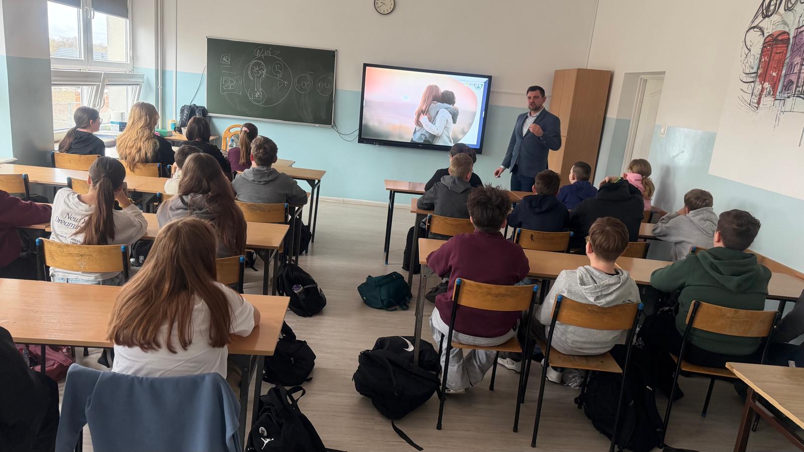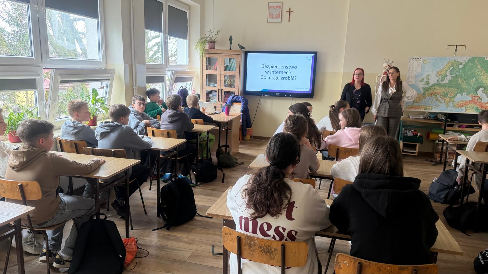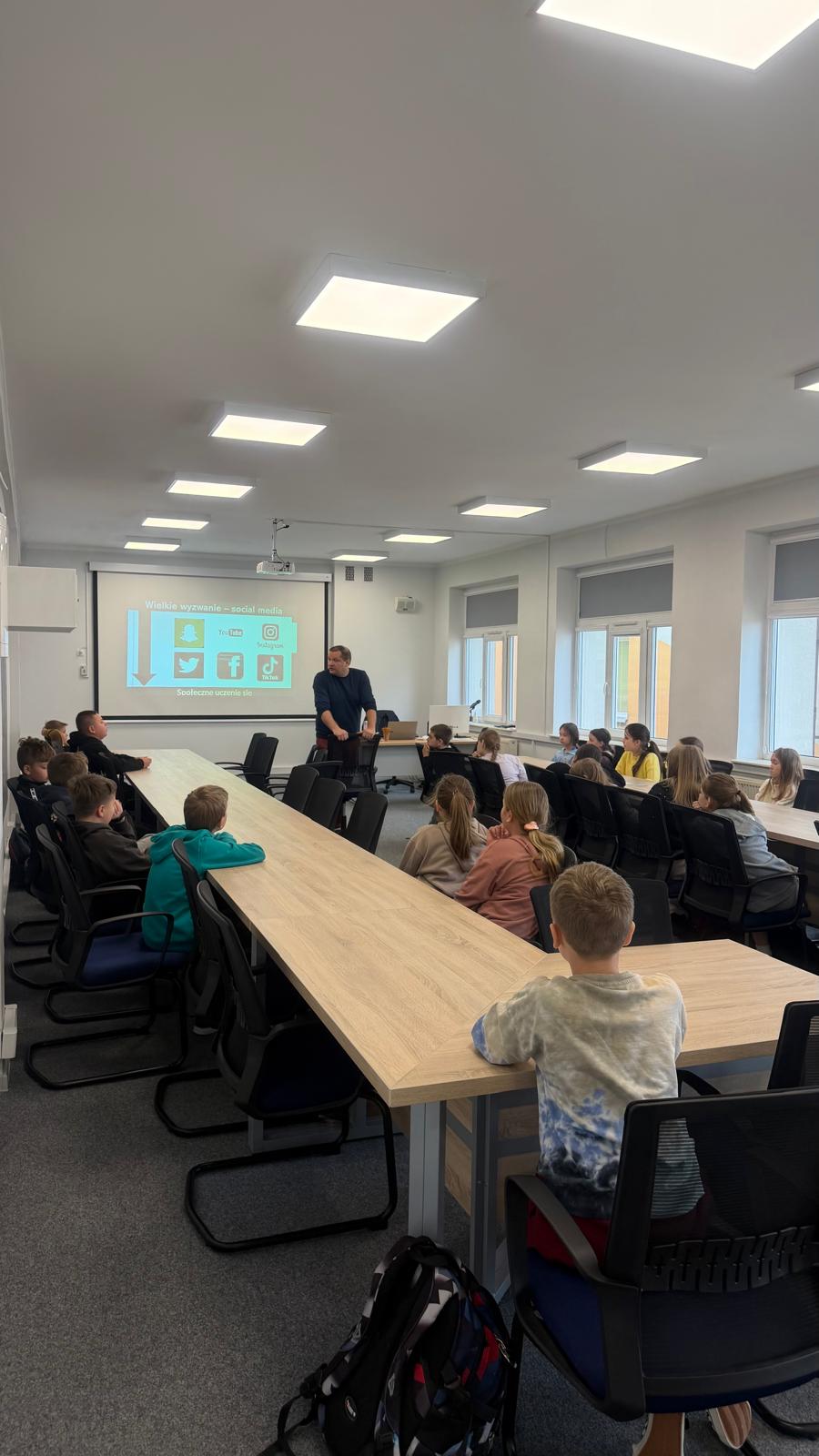 „Nie daj się złapać w sieci – bezpieczeństwo w Internecie” to warsztaty przeznaczone dla uczniów klas: 4a, 4b, 5a, 5b, 6a, 6b szkoły podstawowej. Miały one na celu podniesienie świadomości uczestników w zakresie bezpiecznego korzystania z Internetu, ochrony danych osobowych, rozpoznawania prób oszustw (np. phishingu), cyberprzemocy oraz zasad odpowiedzialnego poruszania się w sieci. Uczniowie klas: 7a,7b SP i klasy I, II, III liceum uczestniczyli natomiast w warsztatach „Przyjaźń w czasach Internetu – o zapomnianej wartości kontaktów face to face”. Celem warsztatów było zwrócenie uwagi na znaczenie bezpośrednich relacji międzyludzkich w dobie cyfryzacji, rozwijanie umiejętności komunikacji interpersonalnej, budowania trwałych relacji, empatii oraz wzmacniania więzi społecznych poza światem wirtualnym.