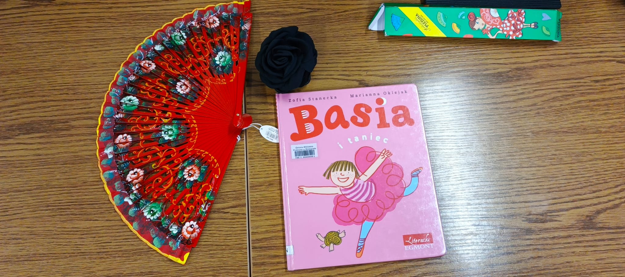 Po lekturze Pani zaprosiła dzieci i pokazała za pomocą rekwizytów (kolorowy wachlarz, czarna róża oraz ozdobne pałeczki), jak wyglądają niektóre tańce.