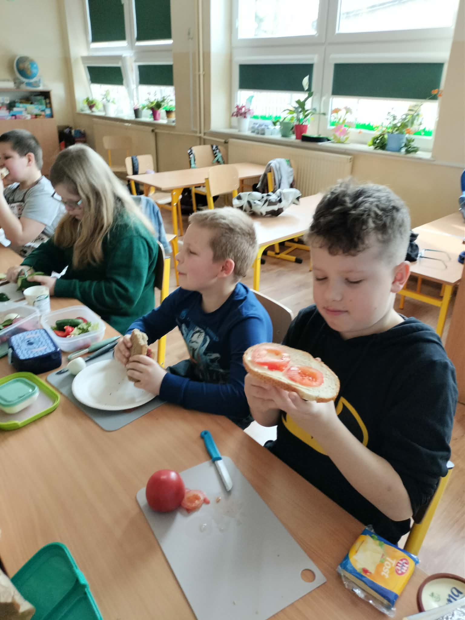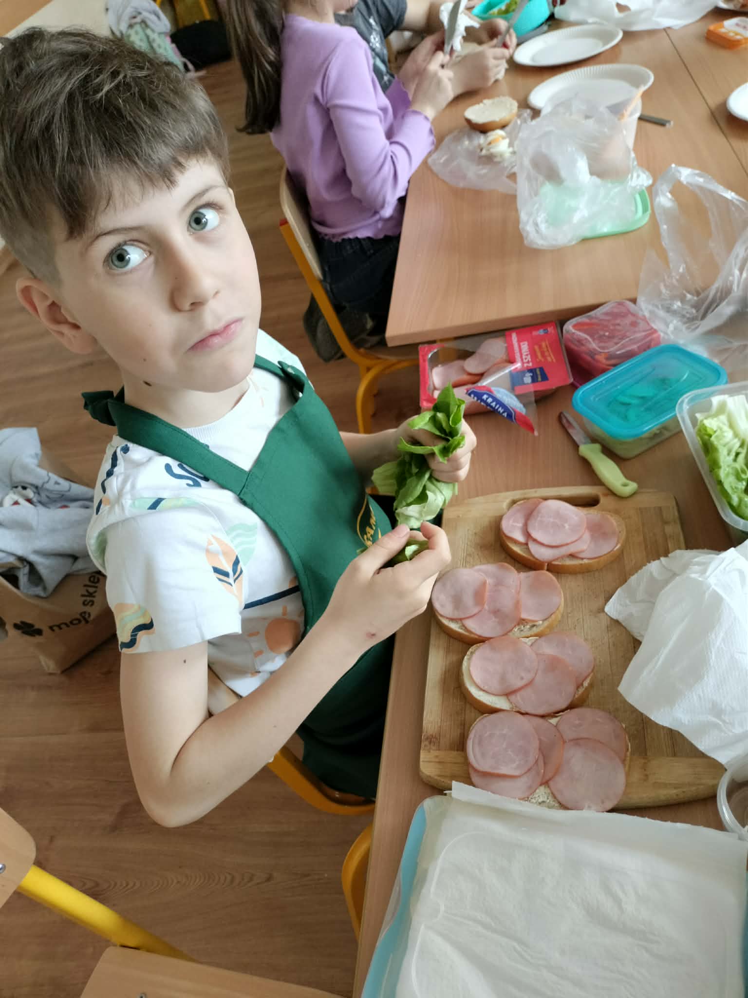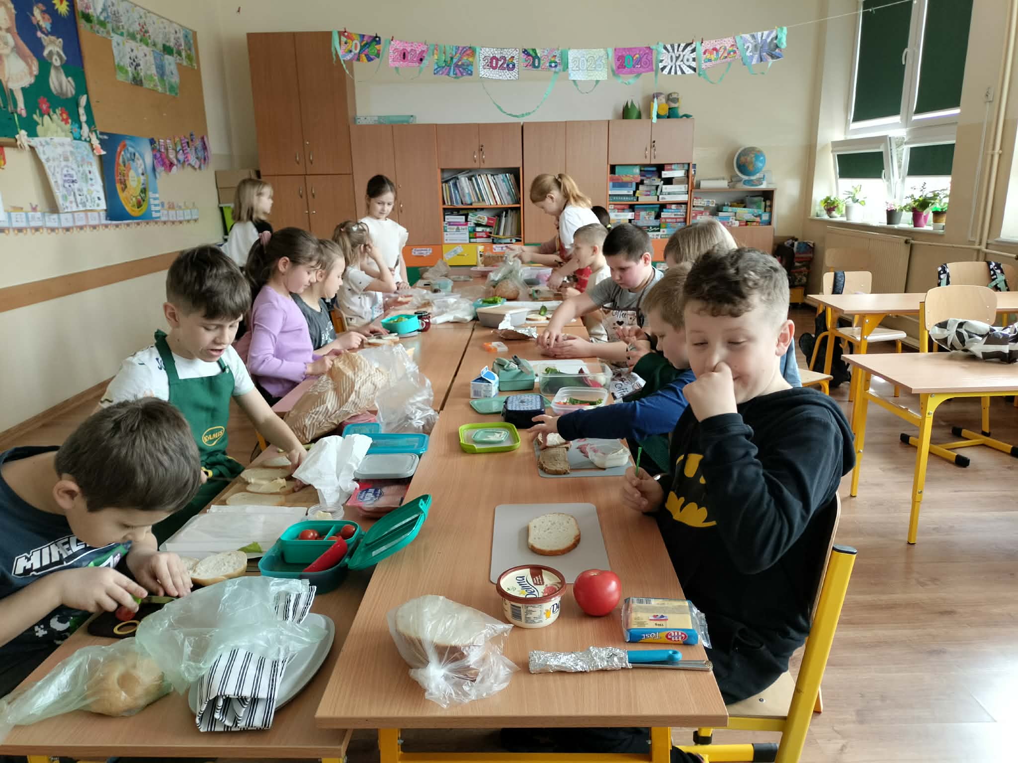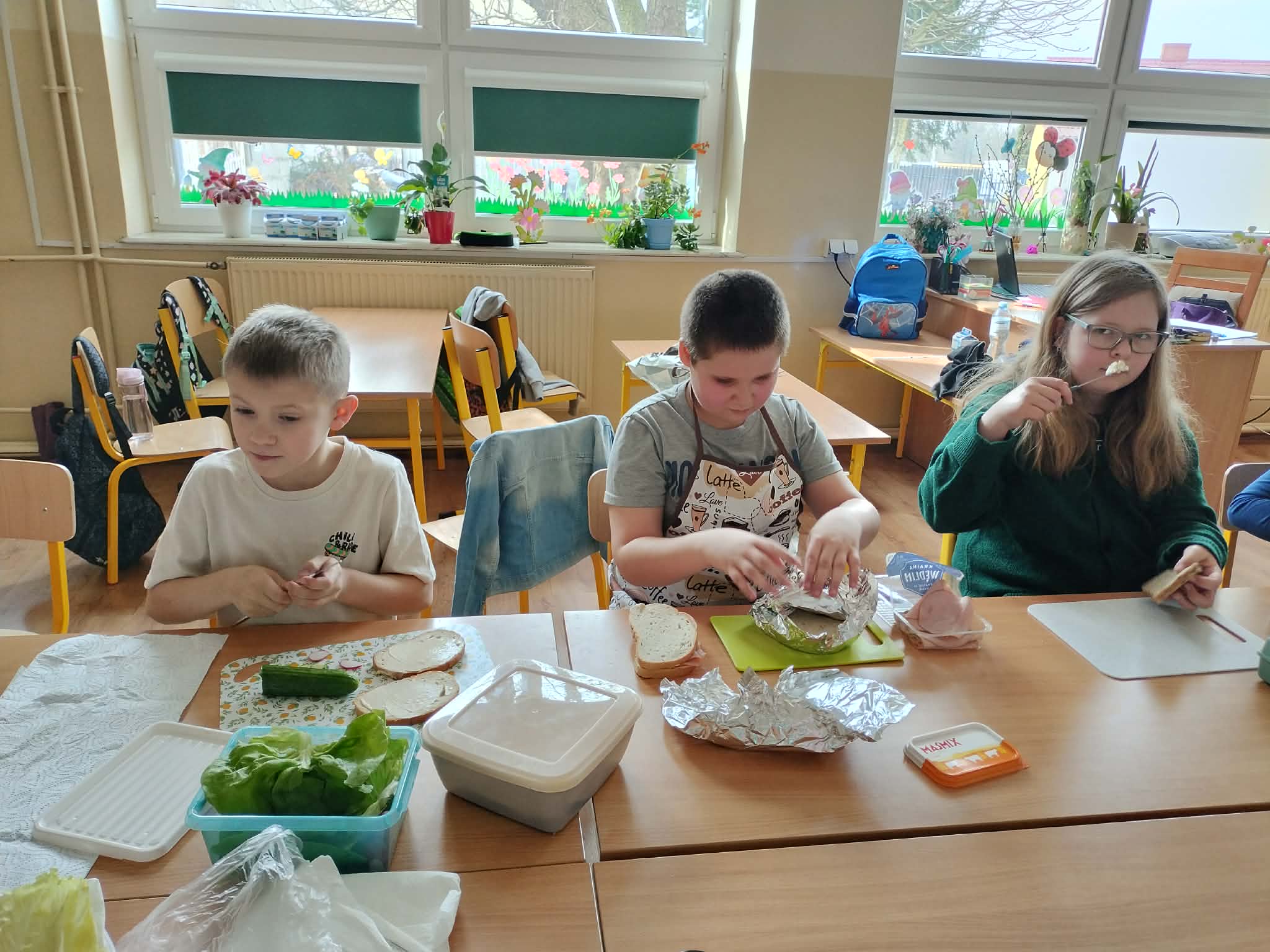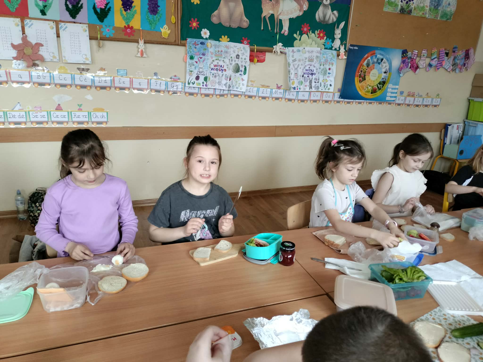W ramach realizacji treści programowych z zakresu edukacji przyrodniczej i technicznej uczniowie klas 2a oraz 2c wzięli udział w zajęciach poświęconych zdrowemu odżywianiu oraz kształtowaniu praktycznych umiejętności kulinarnych. Podczas zajęć dzieci samodzielnie przygotowywały wiosenne kanapki, wykorzystując świeże warzywa, pełnoziarniste pieczywo oraz różnorodne dodatki. Uczniowie przypomnieli sobie zasady higieny podczas przygotowywania posiłków, a także poznali wartości odżywcze wybranych produktów. Zajęcia miały na celu: