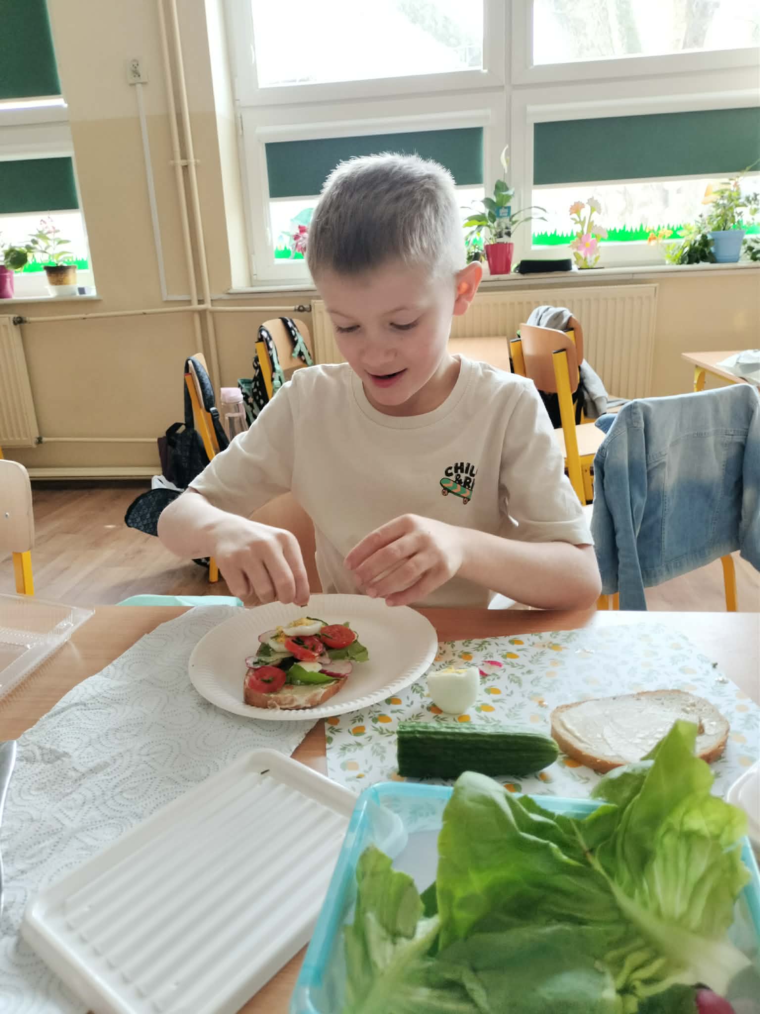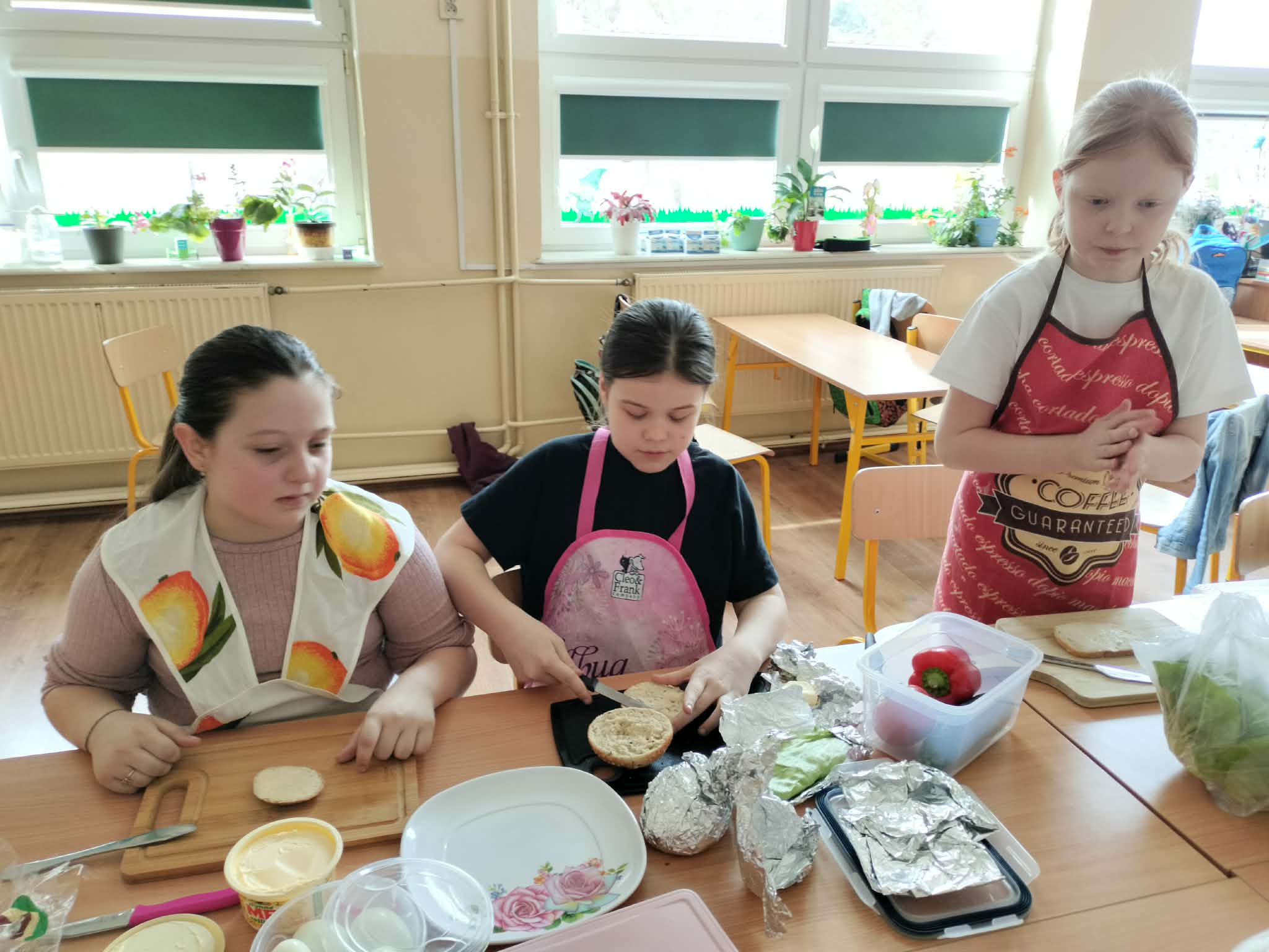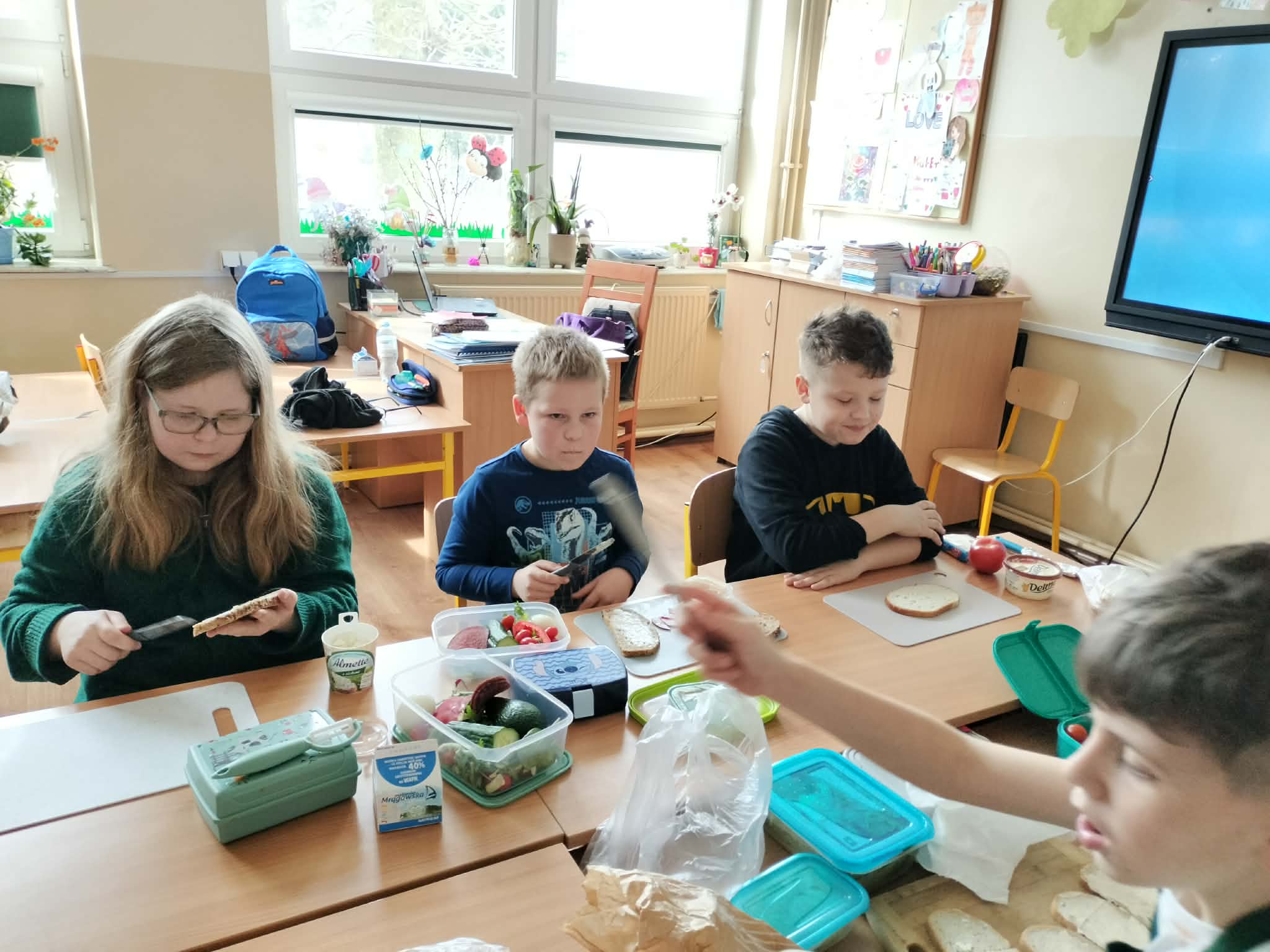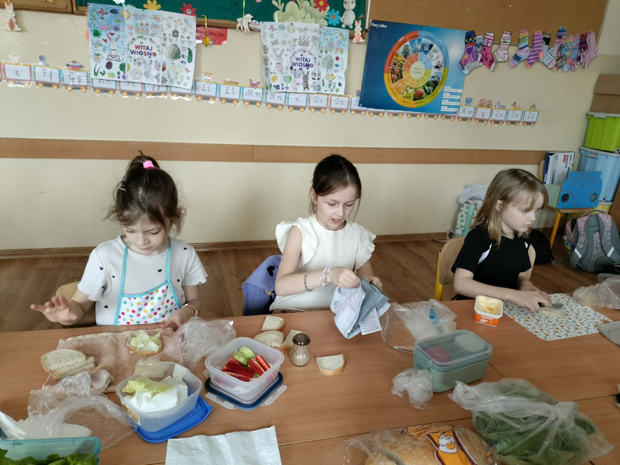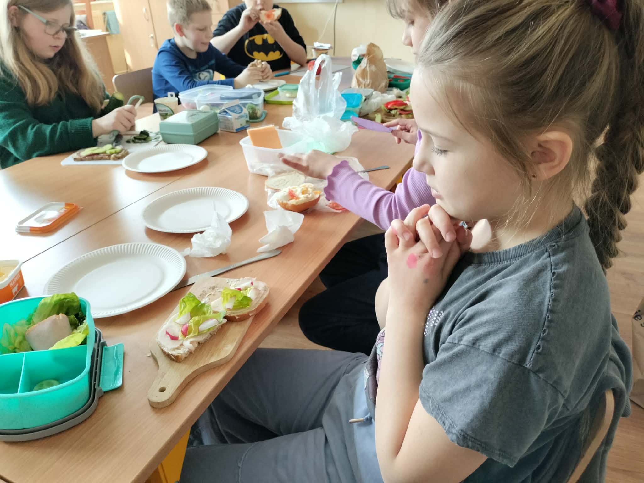 W ramach realizacji treści programowych z zakresu edukacji przyrodniczej i technicznej uczniowie klas 2a oraz 2c wzięli udział w zajęciach poświęconych zdrowemu odżywianiu oraz kształtowaniu praktycznych umiejętności kulinarnych. Podczas zajęć dzieci samodzielnie przygotowywały wiosenne kanapki, wykorzystując świeże warzywa, pełnoziarniste pieczywo oraz różnorodne dodatki. Uczniowie przypomnieli sobie zasady higieny podczas przygotowywania posiłków, a także poznali wartości odżywcze wybranych produktów. Zajęcia miały na celu: