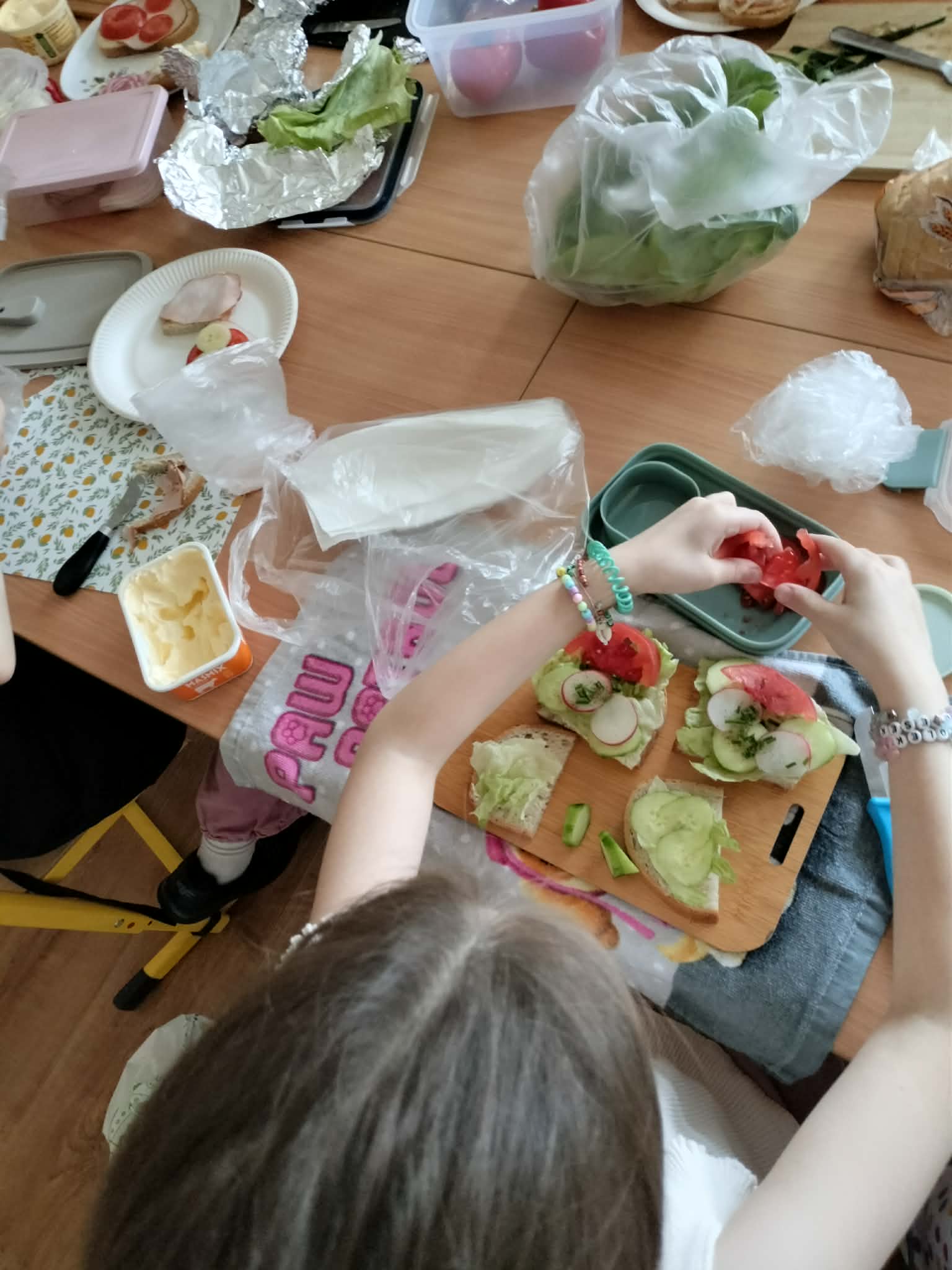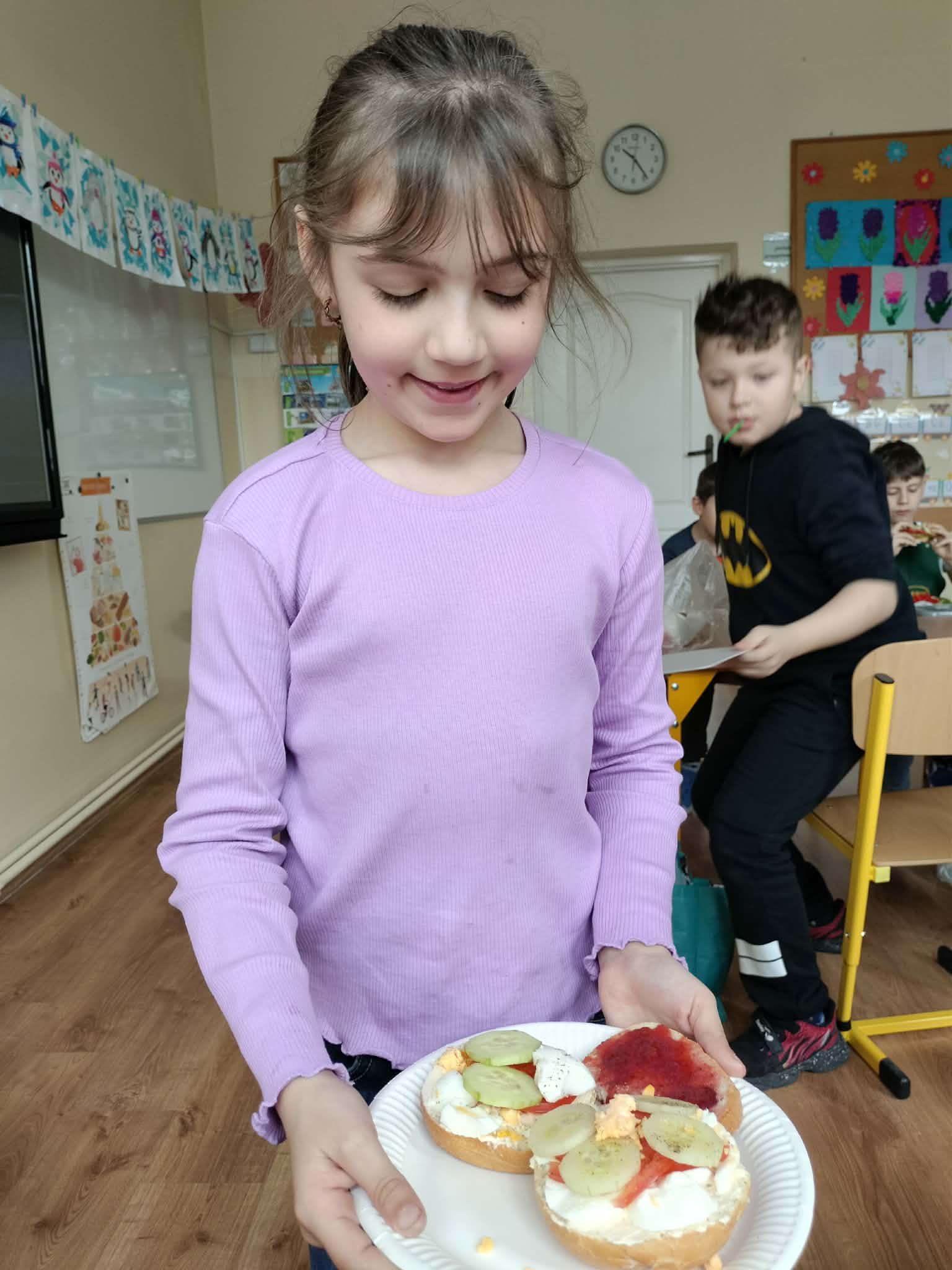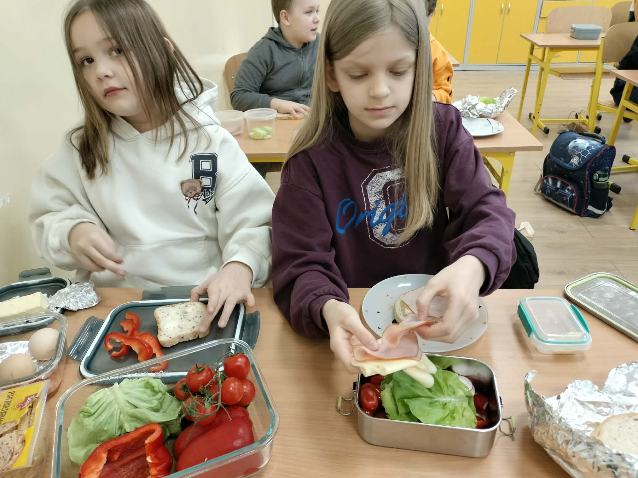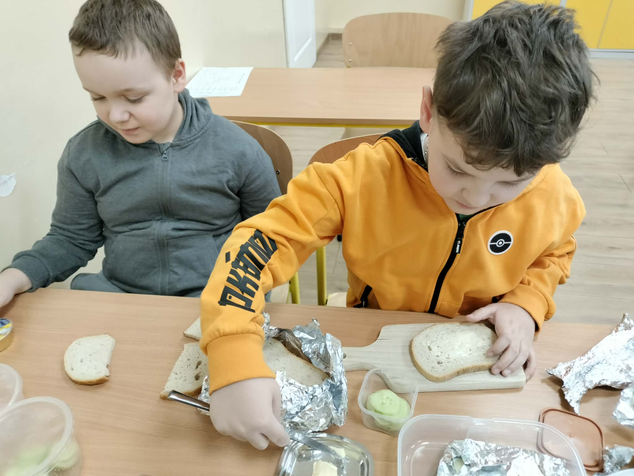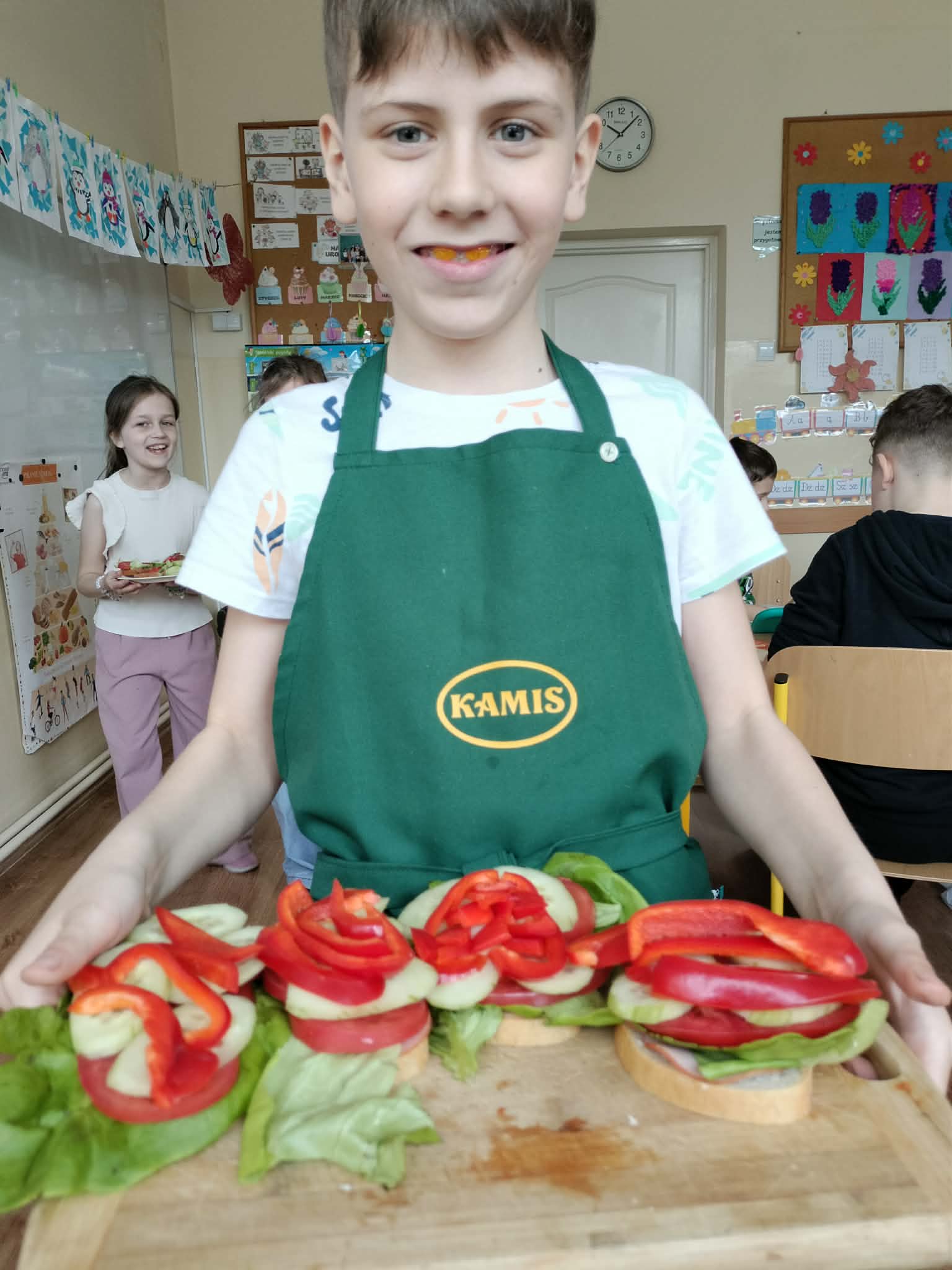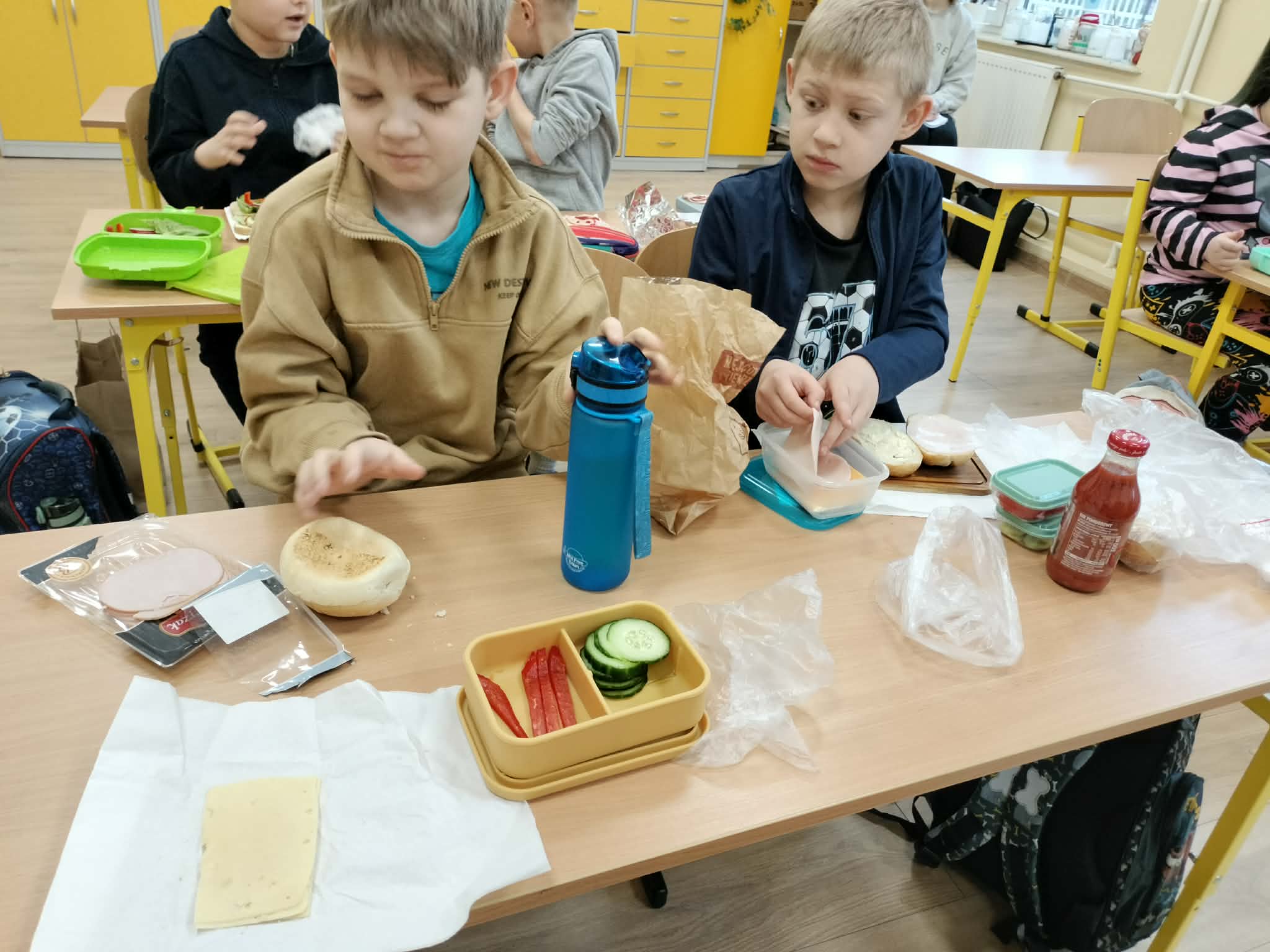 W ramach realizacji treści programowych z zakresu edukacji przyrodniczej i technicznej uczniowie klas 2a oraz 2c wzięli udział w zajęciach poświęconych zdrowemu odżywianiu oraz kształtowaniu praktycznych umiejętności kulinarnych. Podczas zajęć dzieci samodzielnie przygotowywały wiosenne kanapki, wykorzystując świeże warzywa, pełnoziarniste pieczywo oraz różnorodne dodatki. Uczniowie przypomnieli sobie zasady higieny podczas przygotowywania posiłków, a także poznali wartości odżywcze wybranych produktów. Zajęcia miały na celu: